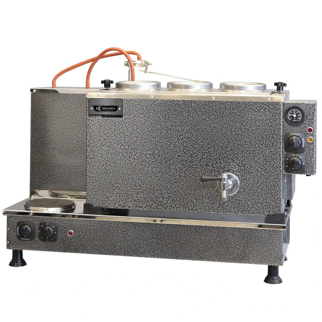 ELEKTRİKLİ PLEYTLİ ÇAY KAZANLARININ TEKNİK ÖZELLİKLERİ ISITMA SEÇENEKLERİ: Çay Kazanlarımız; 1-Sadece elektrikli olmak üzere ısıtma sağlar, ISI YALITIMLI KAZAN GÖVDESİ: İç kazan ve dış kazan arasındaki ısı yalıtımlı 5 cm kalınlığındaki izolasyon sayesinde Isı kaybını ve gereksiz enerji sarfiyatını önleyerek, ekonomik olarak çok yüksek oranda avantaj sağlar. ARITMA: Ürün üzerinde bulunan su arıtma cihazı, kazana yumuşatılmış nitelikli su girişini sağlar. ŞAMANDIRA: boyut ve renk fark etmeksizin bütün çay kazanı modellerimizde Su seviyesi belirlenen ölçüde otomatik olarak kontrol eder. Manuel olarak su takviye etmenize kolaylık sağlayan bir özelliktir. AÇILABİLİR ÜST KAPAK: Tüm çay kazanı modellerimizde kazanların üst kapağı açıldığından dolayı kazanların periyodik iç temizliği son derece pratiktir. FULL OTOMATİK: Tüm çay kazanı modellerimiz termostatlı olup, elektrik ve gaz kontrolü otomatik olarak sağlanır. ISI GÖSTERGESİ: Çay Kazanları Termometreli (ısı Göstergesi) olup kazan içindeki su sıcaklık değeri gözlemlenebilir... KAHVE PİŞİRME GÖZLERİ: Kahvenizi pişirebilir, ısıyla yapılması gereken herhangi bir ihtiyaçta ısıtabilir. Çayınızı kabartmak istediğinizde kullanabilirsiniz. DEMKEŞ: Demlik koyma yerleri özel tasarlanmış olup, demliğinizi kaymadan rahatça koyabilirsiniz... CE BELGELİ: Tüm modellerimiz doğalgaz uyumludur. ERGONOMİK: Kaliteli yapısı iyi çay demleme özelliği, farklı tasarımı, görsel tasarımı ve fonksiyonel özellikleri ile kullanıcılarına büyük kolaylık sağlar. KAZAN DIŞ YÜZEYLERİ: Antik bakır işleme, elektrostatik fırın boyalı renk çeşitleri veya inox (paslanmaz krom) seçeneklerinden yapılmaktadır. Kaliteli malzeme, teknolojik özelliklere sahip çay kazanlarımızı, satış sonrası teknik servis hizmetimize güvenerek alabilirsiniz.